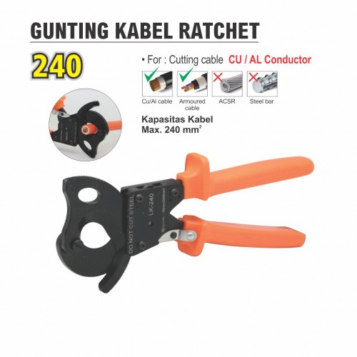 Untuk memotong kabel tembaga dan alumunium Tidak untuk memotong kawat besi dan baja Kapasitas Kabel Max 240 mm3 Quantity : 1 pcs / ktk