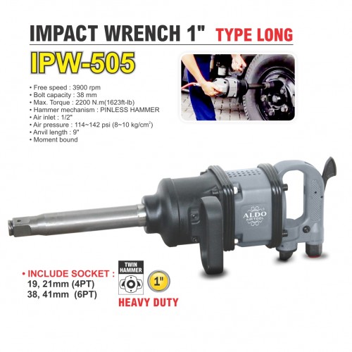 Free speed : 3900 r.p.m Bolt capacity : 38 mm Max. torque : 2200 N.m (16232 ft-lb) Hammer mechanisme : PINLESS HAMMER Air inlet : 1/2 inch Air pressure : 8 - 10 kg/cm2 Anvil length : 9 inch Moment bound : 1200 - 2000 N.m N.W. : 13.7 kg Plus socket : 38,41 mm