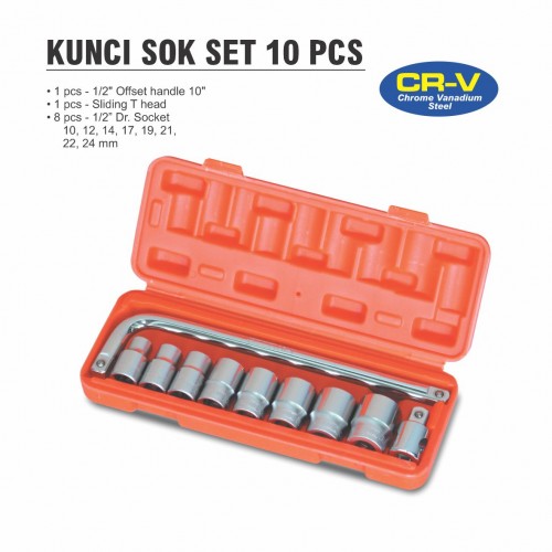 Head treated crome vanadium steel Drop forget for extra strenght Highly pully polishing finish CONTENT : 1 pcs - 1/2 inch Offset handle 10 inch 1 pcs - Sliding T head 8 pcs - 1/2 inch Dr. Socket : 8, 9, 10, 12, 14, 17, 19, 24 mm
