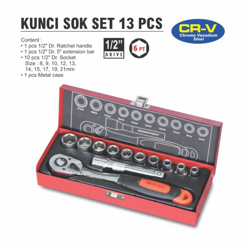 CONTENT : 1 pcs 1/2 inch Dr. Ratchet handle 1 pcs 1/2 inch Dr. 5 inch extension bar 10 pcs 1/2 inch Dr. Socket size : 8, 9, 10, 12, 13, 14, 15, 17, 19, 21 mm 1 pcs metal case