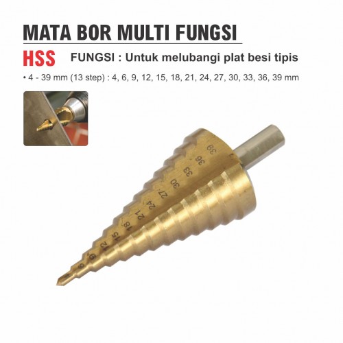 4 - 39 mm (13 step) : 4, 6, 9, 12, 15, 18, 21, 24, 27, 30, 33, 36, 39 mm Fungsi : Untuk melubangi plat besi tipis
