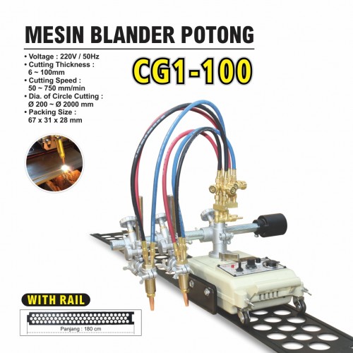 Voltage : 220 V / 50 Hz Cutting Thickness : 6 - 100 mm Cutting Speed : 50 - 750 mm/min Dia of Circle Cutting : 200-2000 mm Rail : 180 cm Quantity : 1 pcs / dos
