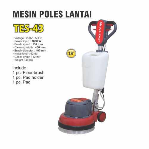 Type : TES-43 Voltage : 220 V - 50 Hz Power input : 1000 W Brush speed : 154 rmp Cleaning width : 450 mm Brush diameter : 450 mm Noise level : 62 db Cable length : 12 mtr Weight : 48 Kg Include : 1 pc. Floor brush 1 pc. Pad holder 1 pc. Pad