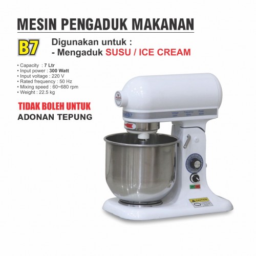 Digunakan untuk : - Mengaduk SUSU / ICE CREAM - TIDAK BOLEH untuk adonan tepung Capacity : 7 Ltr Input power : 300 Watt Input voltage : 220 V Rated frequency : 50 Hz Mixing speed : 60 ~ 680 rpm Weight : 17 kg