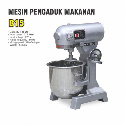 Capacity : 15 Ltr Input power : 370 Watt Input voltage : 220 Volt Rated frequency : 50 Hz Mixing speed : 170 / 340 rpm Weight : 47 Kg