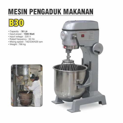 Capacity : 30 Ltr Input power : 1500 Watt Input voltage : 220 Volt Rated frequency : 50 Hz Mixing speed : 142 / 234 / 429 rpm Weight : 72 Kg