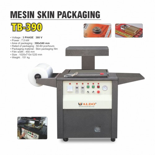 Model : TB-390 Voltage : 3 PHASE 380 V Frequency : 50 Hz Power : 7.5 kW Area of packaging : 0390 x 540 mm Rated of packaging : 50 - 60 pcs/hours Packaging material : Skin packaging film Film width : 450 mm Size : 1020 x 710 x 1220 mm Weight : 180 kg