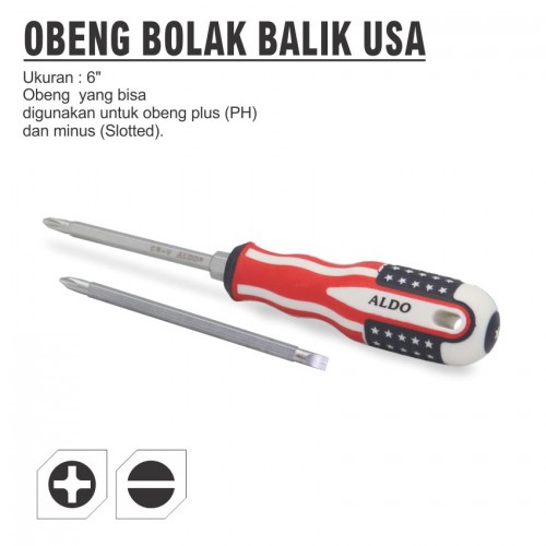 Obeng dengan dua jenis mata obeng pada dua sisi yang berbeda, bisa diganti-ganti sesuai kebutuhan. Handle with magnetic tip Bolak balik min dan plus