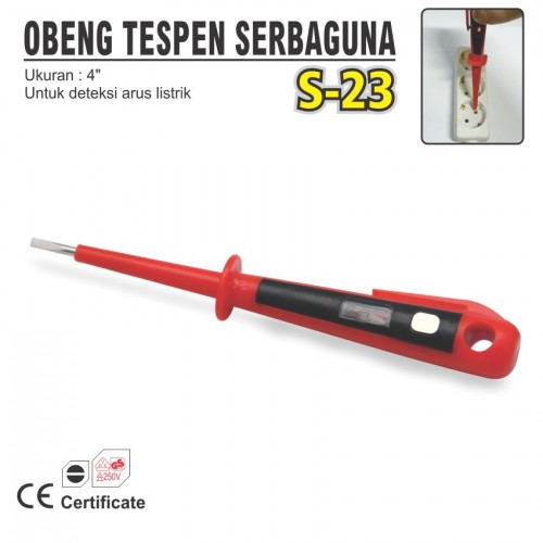 Obeng dengan batang tespen sebagai alat bantu cek arus listrik, jika ada arus listrik maka otomatis gagang akan menyala.