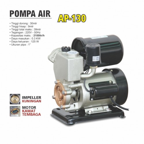 Tinggi dorong : 30mtr Tinggi hisap : 9mtr Tinggi total maks : 39mtr Tegangan : 220V - 50Hz Kapasitas maks. : 35ltr/min Daya masukan : 0.3 KW Daya keluaran : 125 W Ukuran pipa : 1”