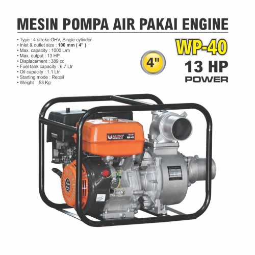 Type : 4 stroke OHV, Single cylinder Inlet & outlet size : 100 mm ( 4” ) Max. capacity : 1000 L/m Max. output : 13 HP Displacement : 389 cc Fuel tank capacity : 6.7 Ltr Oil capacity : 1.1 Ltr Starting mode : Recoil