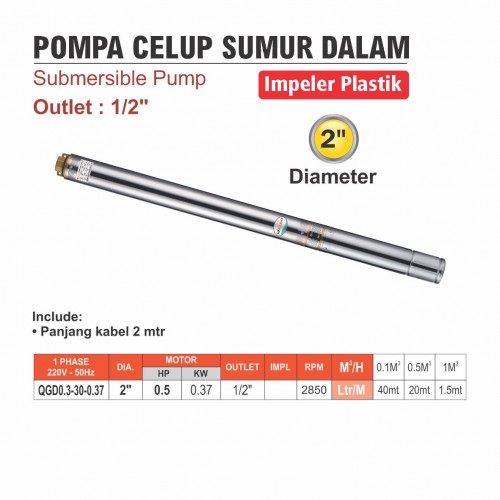 Dia : 2 inch Motor : Hp : 0.5 KW : 0.37 Outlet : 1/2 inch Speed : 2850 Rpm Head (meter) : 40 mt = 0.1 m3 20 mt = 0.5 m3 1.5 mt = 1 m3