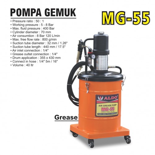 Pressure ratio : 50 : 1 Working pressure : 5 - 8 Bar Max. fluid pressure : 400 Bar Cylinder diameter : 70 mm Air consumtion : 8 Bar 120 L/min Max. free flow rate : 800 g/min Suction tube diameter : 32 mm / 1.26 inch Suction tube length : 440 mm / 17.5 inch Air inlet connection : 1/4 inch Grease oultet connection : 1/4 inch Drum application : 355 x 430 mm Connect in hose : 1/4 inch 5m / 16 inch Volume : 40 ltr Weight : 30 Kg