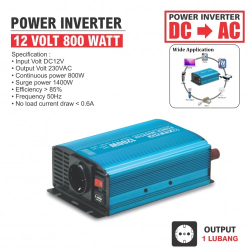 Specification : • Input Volt DC12V • Output Volt 230VAC • Continuous power 800W • Surge power 1400W • Efficiency > 85% • Frequency 50Hz • No load current draw < 0.6A
