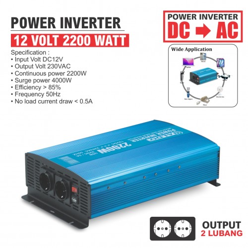 Specification : • Input Volt DC12V • Output Volt 230VAC • Continuous power 2200W • Surge power 4000W • Efficiency > 85% • Frequency 50Hz • No load current draw < 0.5A
