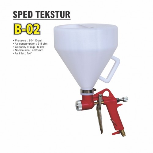 Pressure : 90-110 psi Air consumption : 6-8 cfm Capacity of cup : 6 liter Nozzle size : 4/6/8 mm Air inlet : 1/4 inch