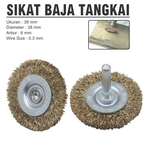 Diameter : 38 mm Arbor : 6 mm Wire size : 0.3 mm Face width : 5 mm Trim length : 8 RPM : 4500