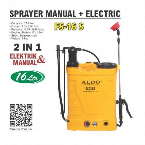Capacity : 16ltr Output : 1.2 - 2.5 L/min pressure : 0.15 - 0.40 Mpa Engine : Battery 12V / 8Ah Stick : stainless steel ELEKTRIK & MANUAL