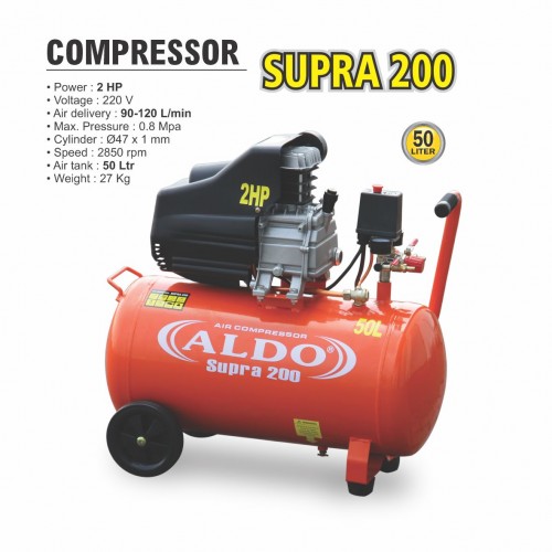 power : 2 HP voltage : 220 V air delivery : 90-120 l/min max. pressure : 0.8 mpa cylinder : 47 x 1 mm speed : 2850 rpm air tank : 50 ltr weight : 27 kg