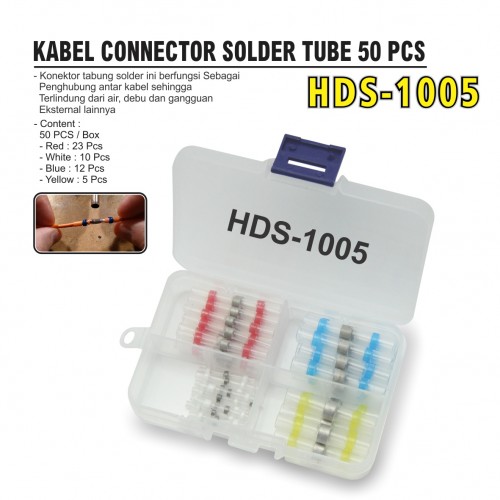 Konektor tabung solder ini berfungsi Sebagai Penghubung antar kabel sehingga Terlindung dari air, debu dan gangguan Eksternal lainnya - Content : 50 PCS / Box - Red : 23 Pcs - White : 10 Pcs - Blue : 12 Pcs - Yellow : 5 Pcs