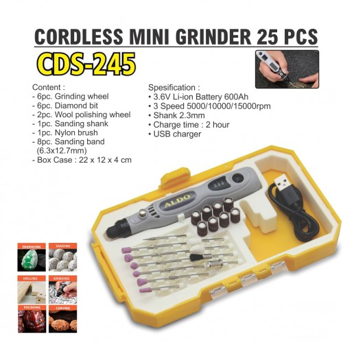 • 3.6V Li-ion Battery 600Ah • 3 Speed 5000/10000/15000rpm • Shank 2.3mm • Charge time : 2 hour • USB charger • 6pc. Grinding wheel • 6pc. Diamond bit • 2pc. Wool polishing wheel • 1pc. Sanding shank • 1pc. Nylon brush • 8pc. Sanding band (6.3x12.7mm)
