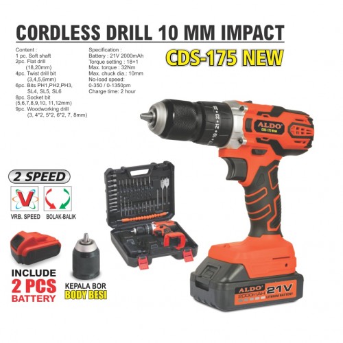 .Battery : 21V 2000mAh • Max. torque : 32Nm • Max. chuck dia. : 10mm • No-load speed : 0-350 / 0-1350rpm • Charge time : 2 hour 1pc. Soft shaft 9pc. Woodworing bit (3,4,4,5,5,6,6,7,8mm) 4pc. Twist drill (3,4,5,6mm) 8pc. Socket bit (5,6,7,8,9,10,11,12,13mm) 2pc. Flat drill (18,20mm) 6pc. Bits