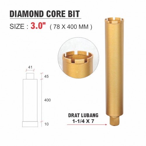 Untuk melubangi granite, marmer, procelin, beton, dll Drat lubang : 1-1/4 x 15 Quantity : 1 pcs / dos