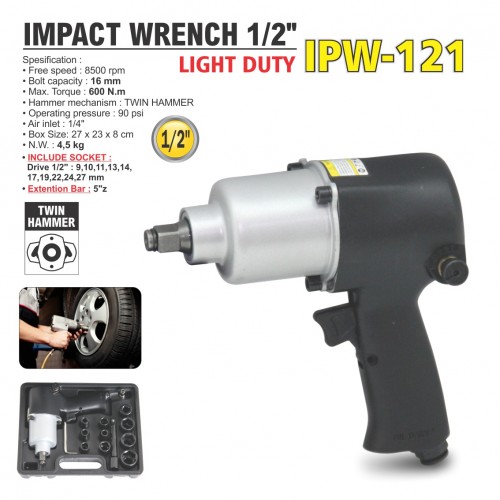 • Free speed : 8500 rpm • Bolt capacity : 16 mm • Max. Torque : 600 N.m • Hammer mechanism : TWIN HAMMER • Operating pressure : 90 psi • Air inlet : 1/4" TWIN HAMMER INCLUDE SOCKET : Drive 1/2" : 9,10,11,13,14,17, 19,22,24,27 mm • Extention Bar : 5"