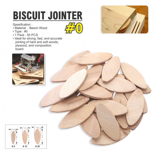 Spesification: • Material : Beech Wood • Type : #0 • 1 Pack : 50 PCS| • Ideal for strong, fast, and accurate jointing of hard and soft woods, plywood, and composition board,