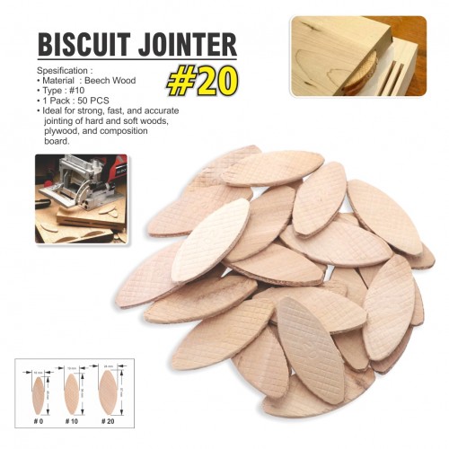 Spesification: • Material : Beech Wood • Type : #20 • 1 Pack : 50 PCS| • Ideal for strong, fast, and accurate jointing of hard and soft woods, plywood, and composition board,