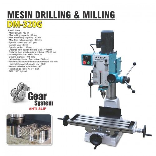 • Motor power : 750 W • Max. drilling capacity : 32 mm • Max. end milling capacity : 20 mm • Max. face milling capacity : 63 mm • Spindle speed : 80-1250 rpm • Spindle taper : MT3 • Spindle stroke : 130 mm • Distance from spindle nose to table : 440 mm • Distance from spindle axis to column : 272.50 mm • Working table size : 800 x 240 mm • Column diameter : 115 mm • Left and right travel of worktable : 500 mm • Forward and backward travel of worktable: 175 mm • Horizontal swiwel of spindle box : 360O • Vertical swiwel of spindle box : 90O