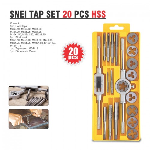 9pc. Hand taps: M3x0.50, M4x0.70, M6x1.00, M7x1.00, M8x1.25, M9x1.25, M10x1.50, M12x1.50, M12x1.75 9pc. Block snei: M3x0.50, M4x0.70, M6x1.00, M7x1.00, M8x1.25, M9x1.25, M10x1.50, M12x1.50, M12x1.75 1pc. Tap wrench M3-M12 1pc. Die wrench 25mm