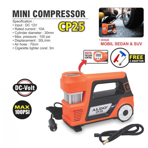 • Input : DC 12V • Rated current : 10A • Cylinder diameter : 30mm • Max. pressure : 100 psi • Displacement : 30L/min • Air hose : 70cm • Cigarette lighter corel: 3m