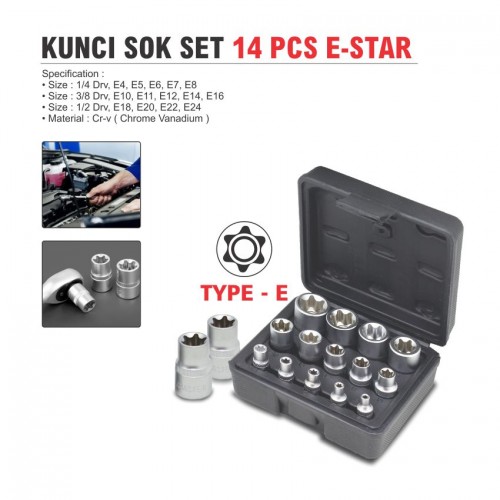 Specification : • Size : 1/4 Drv, E4, E5, E6, E7, E8 • Size : 3/8 Drv, E10, E11, E12, E14, E16 • Size : 1/2 Drv, E18, E20, E22, E24 • Material : Cr-v ( Chrome Vanadium )