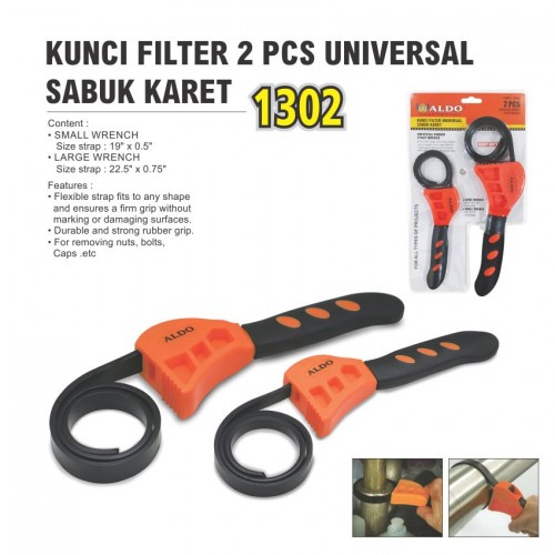 Content : • SMALL WRENCH Size strap : 19" x 0.5" • LARGE WRENCH Size strap : 22.5" x 0.75" Features : • Flexible strap fits to any shape and ensures a firm grip without marking or damaging surfaces. • Durable and strong rubber grip. • For removing nuts, bolts, Caps .etc