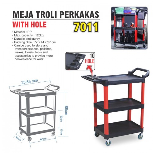 • Material : PP • Max. capacity : 120kg • Durable and sturdy • Packing Size : 77 x 44 x 27 cm • Can be used to store and transport brushes, polishes, waxes, towels, tools and accessories to provide more convenience for work.