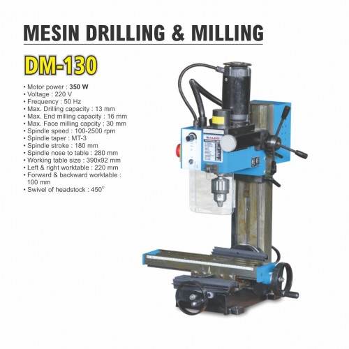 Motor power : 350W Voltage : 220V Frequency : 50Hz Max drilling capacity : 13 mm Max end milling capacity : 16 mm Max face milling capacity : 30 mm Spindle speed : 100 - 2500 rpm Spindle stroke : 180 mm Spindle nose to table : 280 mm Working table size : 390 x 92 mm Left and right worktable : 220 mm Forward and backward worktable : 100 mm Swivel of headstock : 450O