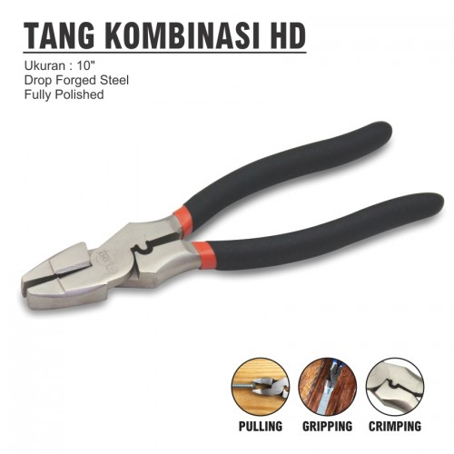 Tang kombinasi dengan dua fungsi, jepit dan potong. Dengan kepala tang yang tebal dan kuat sehingga dapat memotong komponen padat seperti kawat, kabel, dan komponen elektronik lainnya. Material : Crome vanadium steel Heavy duty