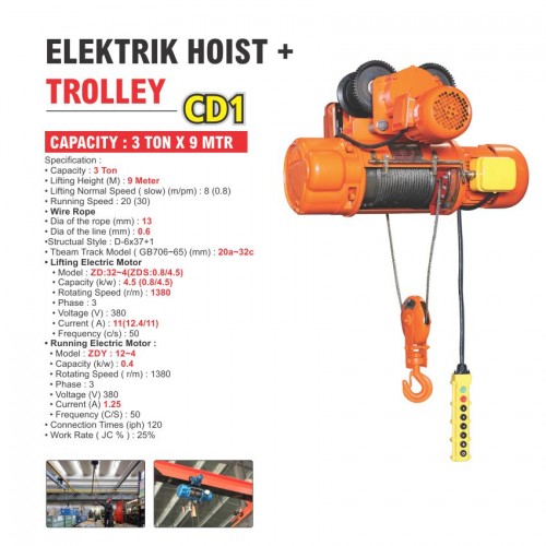Specification : • Capacity : 3 Ton • Lifting Height (M) : 9 Meter • Lifting Normal Speed ( slow) (m/pm) : 8 (0.8) • Running Speed : 20 (30) • Wire Rope • Dia of the rope (mm) : 13 • Dia of the line (mm) : 0.6 •Structual Style : D-6x37+1 • Tbeam Track Model ( GB706~65) (mm) : 20a~32c • Lifting Electric Motor • Model : ZD:32~4(ZDS:0.8/4.5) • Capacity (k/w) : 4.5 (0.8/4.5) • Rotating Speed (r/m) : 1380 • Phase : 3 • Voltage (V) : 380 • Current ( A) : 11(12.4/11) • Frequency (c/s) : 50 • Running Electric Motor : • Model : ZDY : 12~4 • Capacity (k/w) : 0.4 • Rotating Speed ( r/m) : 1380 • Phase : 3 • Voltage (V) 380 • Current (A) 1.25 • Frequency (C/S) : 50 • Connection Times (iph) 120 • Work Rate ( JC % ) : 25%
