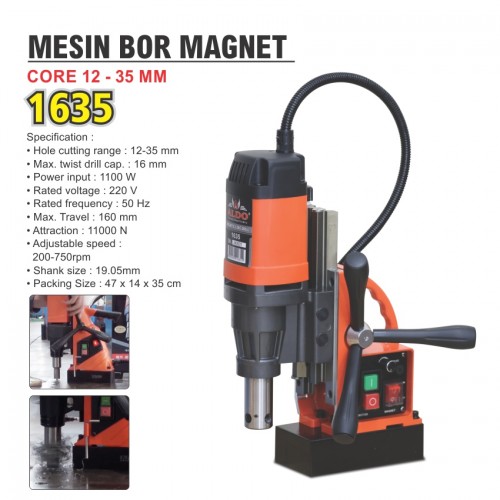 Specification : • Hole cutting range : 12-35 mm • Max. twist drill cap. : 16 mm • Power input : 1100 W • Rated voltage : 220 V • Rated frequency : 50 Hz • Max. Travel : 160 mm • Attraction : 11000 N • Adjustable speed : 200-750rpm • Shank size : 19.05mm • Packing Size : 47 x 14 x 35 cm
