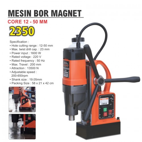 Specification : • Hole cutting range : 12-50 mm • Max. twist drill cap. : 23 mm • Power input : 1600 W • Rated voltage : 220 V • Rated frequency : 50 Hz • Max. Travel : 200 mm • Attraction : 13500 N • Adjustable speed : 200-650rpm • Shank size : 19.05mm • Packing Size : 58 x 21 x 42 cm