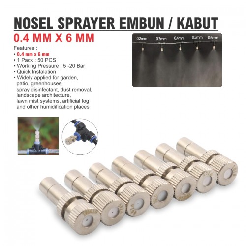 Features : • 0.4 mm x 6 mm • 1 Pack : 50 PCS • Working Pressure : 5 -20 Bar • Quick Instalation • Widely applied for garden, patio, greenhouses, spray disinfectant, dust removal, landscape architecture, lawn mist systems, artificial fog and other humidification places