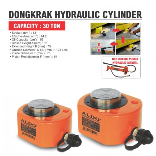 • Stroke ( mm ) : 13 • Efective Area (cm2) : 44.2 • Oil Capacity (cm2) : 55 • Closed Height A (mm) : 62 • Extended Height B (mm) : 75 • Outside Diameter D x L ( mm ) : 123 x 98 • Inside Diameter E (mm ) : 75 • Piston Rod diameter F ( mm ) : 64