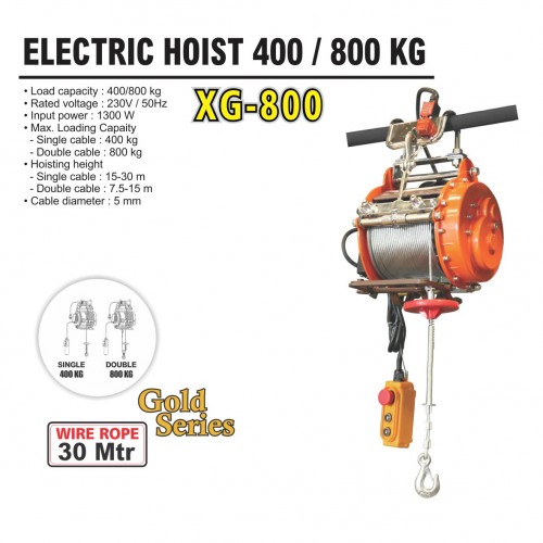 Load capacity : 400/800 kg Rated voltage : 230V / 50Hz Input power : 1300 W Max. Loading Capaity - Single cable : 400 kg - Double cable : 800 kg Hoisting height - Single cable : 15-30 m - Double cable : 7.5-15 m Cable diameter : 5 mm Weight : 36 kg Quantity : 1 pcs / dos