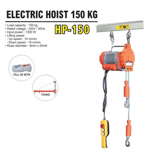 Rated load weight : 150 kg Input power : 1300 W Voltage / frequency : 230 V / 50 Hz Lifting speed : Up : 14 m/min Down : 19 m/min Rope diameter : 8 mm x 25 mtr Quantity : 1 pcs / dos