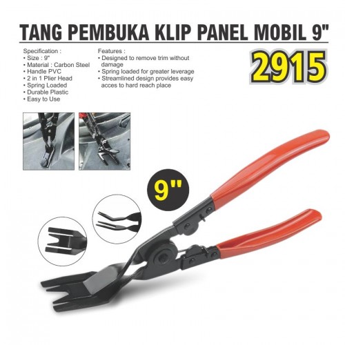 Specification : • Size : 9" • Material: Carbon Steel • Handle PVC • 2 in 1 Plier Head • Spring Loaded • Durable Plastic • Easy to Use Features : • Designed to remove trim without damage • Spring loaded for greater leverage • Streamlined design provides easy acces to hard reach place