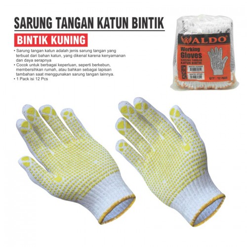 • Sarung tangan bintik adalah jenis sarung tangan yang memiliki bintik-bintik pada permukaan telapak dan jari. • Bintik-bintik ini berfungsi untuk meningkatkan daya cengkeram, sehingga memberikan pegangan yang lebih baik saat melakukan berbagai aktivitas. • Cocok untuk kegiatan berkebun, pekerjaan rumah, atau industri ringan