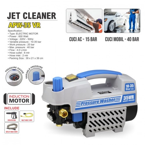 Type :ELECTRIC MOTOR • Power : 600 Watt • Voltage : 220V - 50Hz • Variable pressure : 10-35 bar • Work pressure : 20 bar • Max. pressure : 40 bar • Flow : 4.0 L/min • Hose outlet : 8 mtr • Hose inlet : 2 mtr