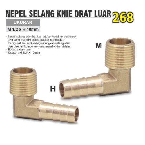 Nepel selang knie drat luar adalah konektor berbentuk siku yang memiliki drat di bagian luar (male). Ini digunakan untuk menghubungkan selang atau pipa dengan komponen yang memiliki drat dalam. Bahan : Kuningan Ukuran : M 1/2" X H 10 mm