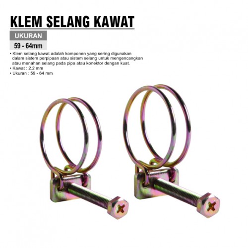 • Klem selang kawat adalah komponen yang sering digunakan dalam sistem perpipaan atau sistem selang untuk mengencangkan atau menahan selang pada pipa atau konektor dengan kuat. • Kawat : 2.2 mm • Ukuran :59 - 64 cm